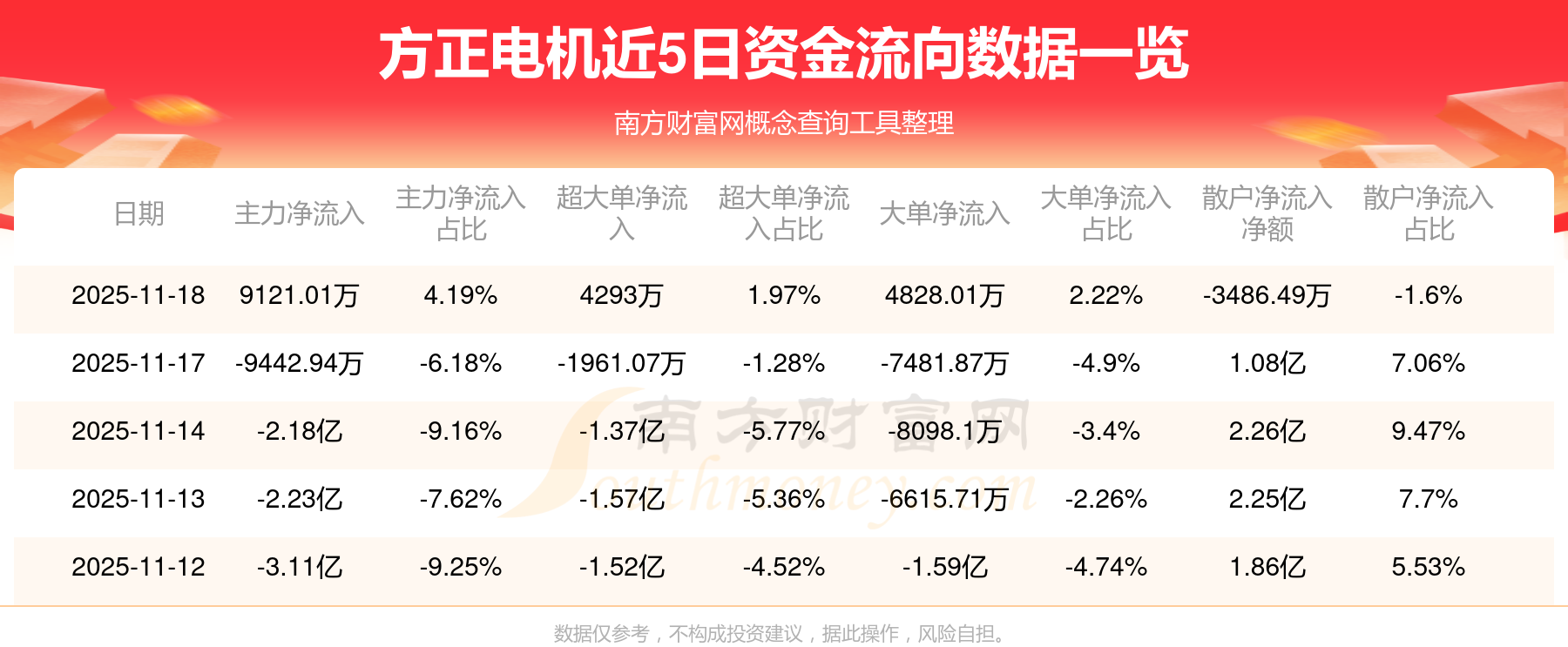 11月18日消息,方正电机11月18日主力资金净流入9121.01万元,超大单资金净流入4293万元,大单资金净流入4828.01万元,散户资金净流出3486.49万元。