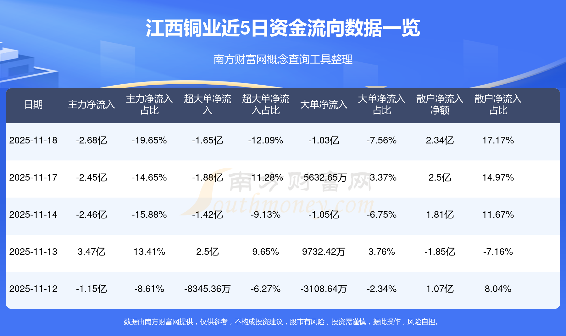 11月18日消息,江西铜业11月18日主力资金净流出2.68亿元,超大单资金净流出1.65亿元,大单资金净流出1.03亿元,散户资金净流入2.34亿元。