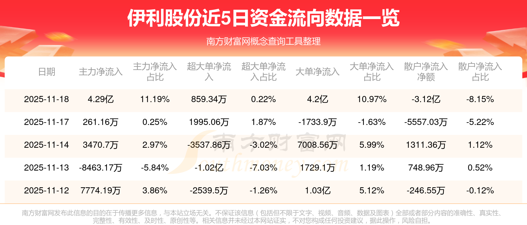 11月18日消息,伊利股份主力资金净流入4.29亿元,超大单资金净流入859.34万元,散户资金净流出3.12亿元。