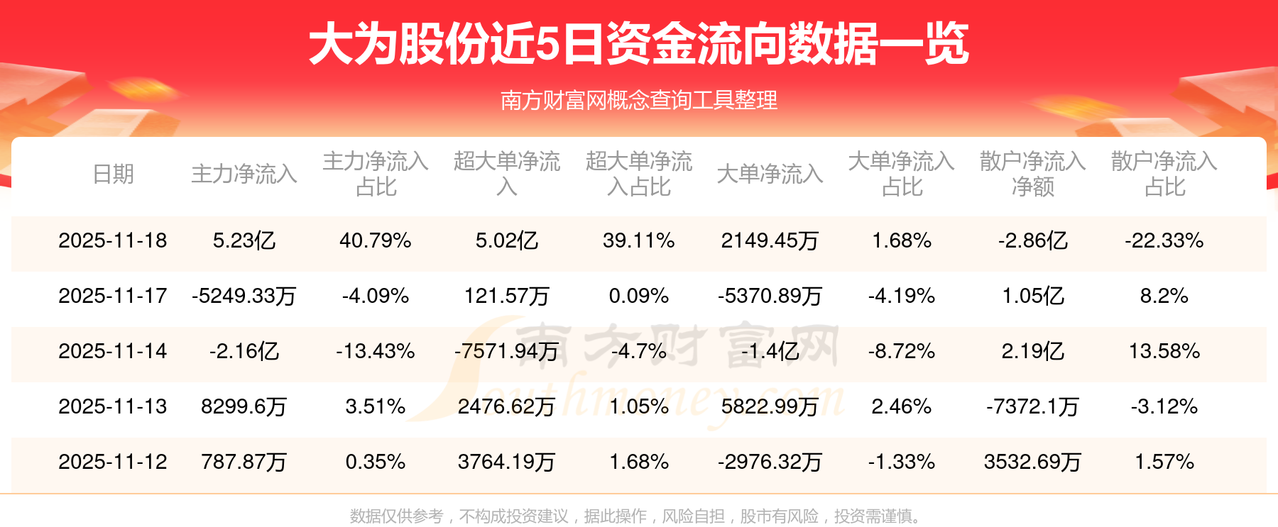 11月18日消息,大为股份11月18日主力净流入5.23亿元,超大单净流入5.02亿元,大单净流入2149.45万元,散户净流出2.86亿元。