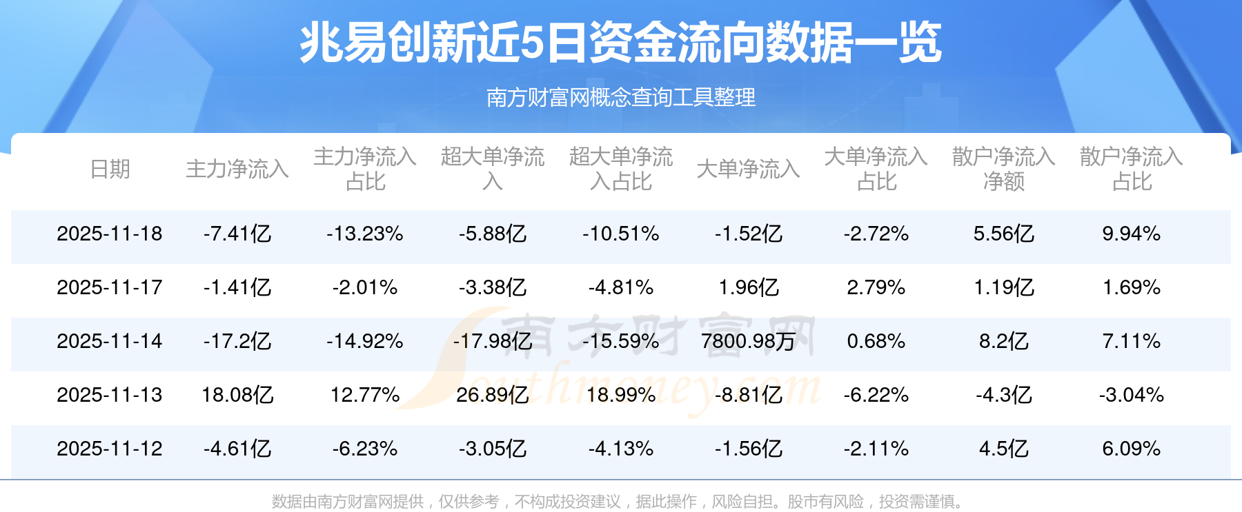 11月18日消息,兆易创新11月18日主力净流出7.41亿元,超大单净流出5.88亿元,大单净流出1.52亿元,散户净流入5.56亿元。