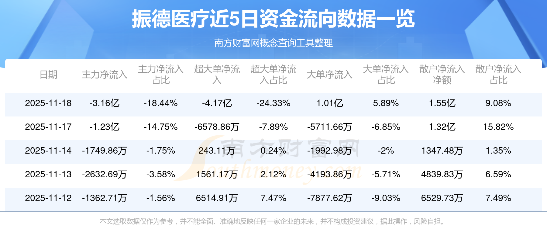 11月18日消息,振德医疗资金净流出3.16亿元,超大单资金净流出4.17亿元,换手率8.36%,成交金额17.12亿元。