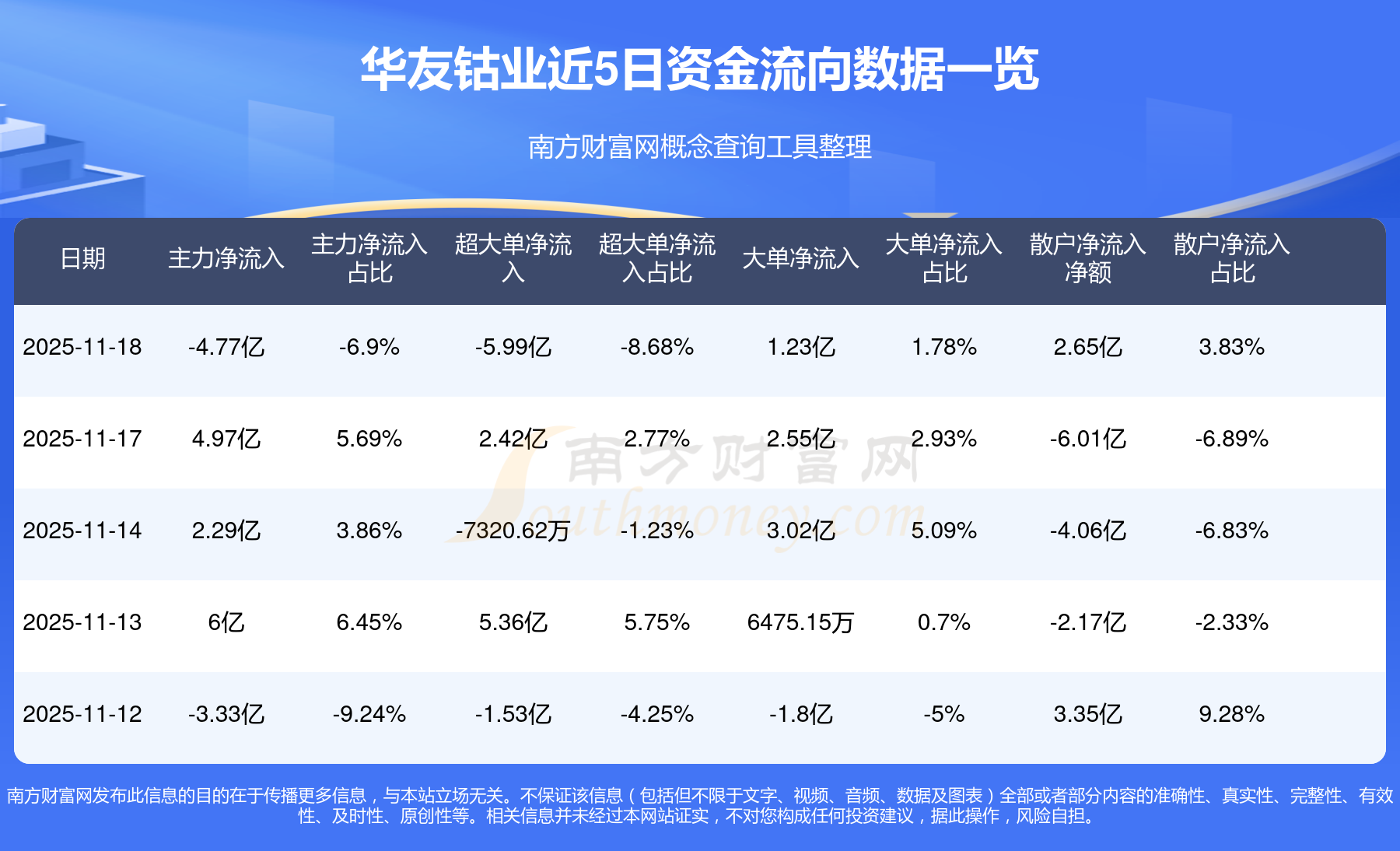 11月18日消息,华友钴业11月18日主力资金净流出4.77亿元,超大单资金净流出5.99亿元,大单资金净流入1.23亿元,散户资金净流入2.65亿元。