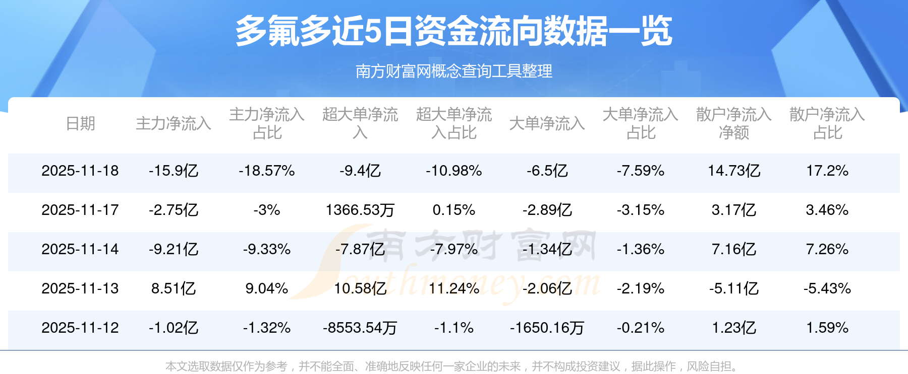 11月18日消息,多氟多资金净流出15.9亿元,超大单资金净流出9.4亿元,换手率20.77%,成交金额85.63亿元。