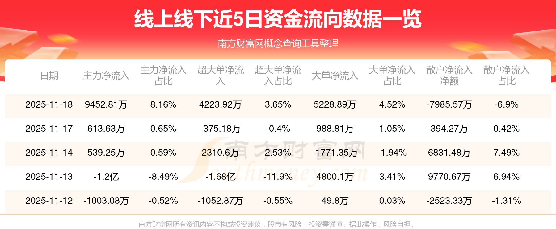 11月18日消息,线上线下主力资金净流入9452.81万元,超大单资金净流入4223.92万元,散户资金净流出7985.57万元。