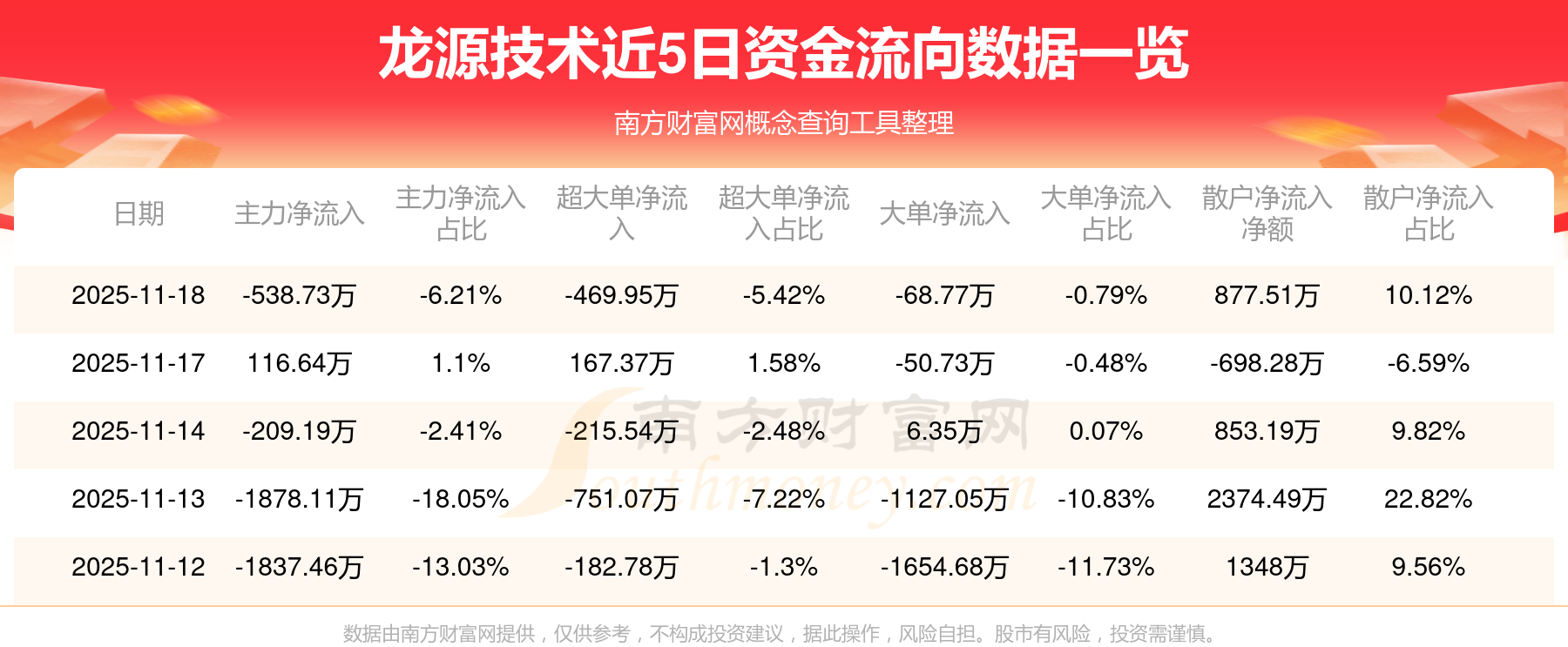 11月18日消息,龙源技术11月18日主力资金净流出538.73万元,超大单资金净流出469.95万元,大单资金净流出68.77万元,散户资金净流入877.51万元。