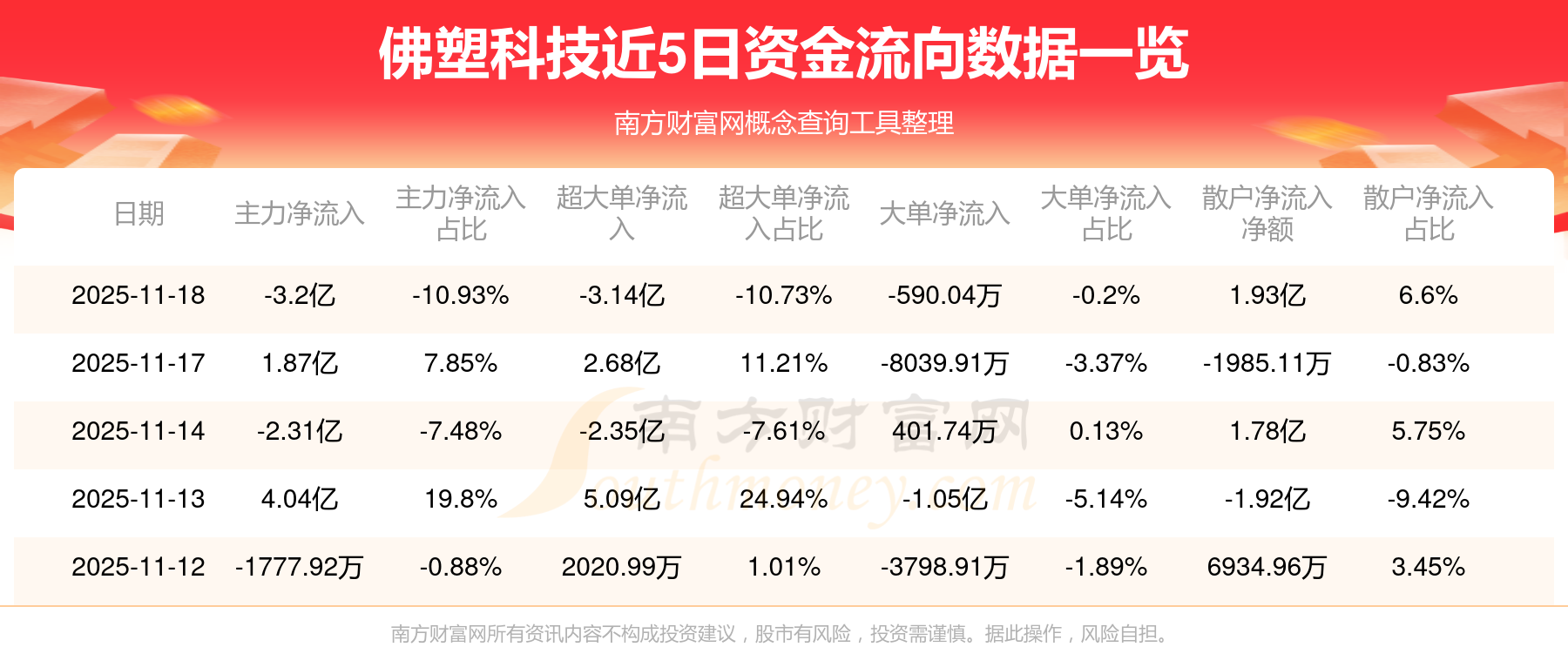 11月18日消息,佛塑科技11月18日主力资金净流出3.2亿元,超大单资金净流出3.14亿元,大单资金净流出590.04万元,散户资金净流入1.93亿元。
