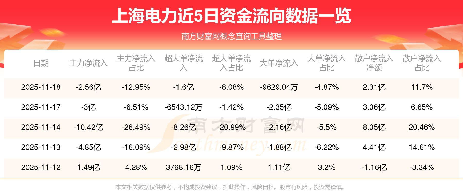 11月18日消息,上海电力主力资金净流出2.56亿元,超大单资金净流出1.6亿元,散户资金净流入2.31亿元。