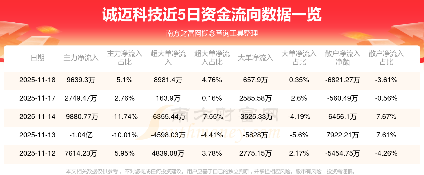 11月18日消息,诚迈科技主力净流入9639.3万元,超大单净流入8981.4万元,散户净流出6821.27万元。