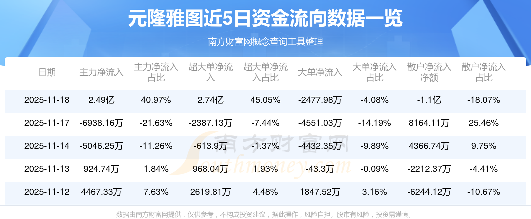 11月18日消息,元隆雅图11月18日主力净流入2.49亿元,超大单净流入2.74亿元,大单净流出2477.98万元,散户净流出1.1亿元。