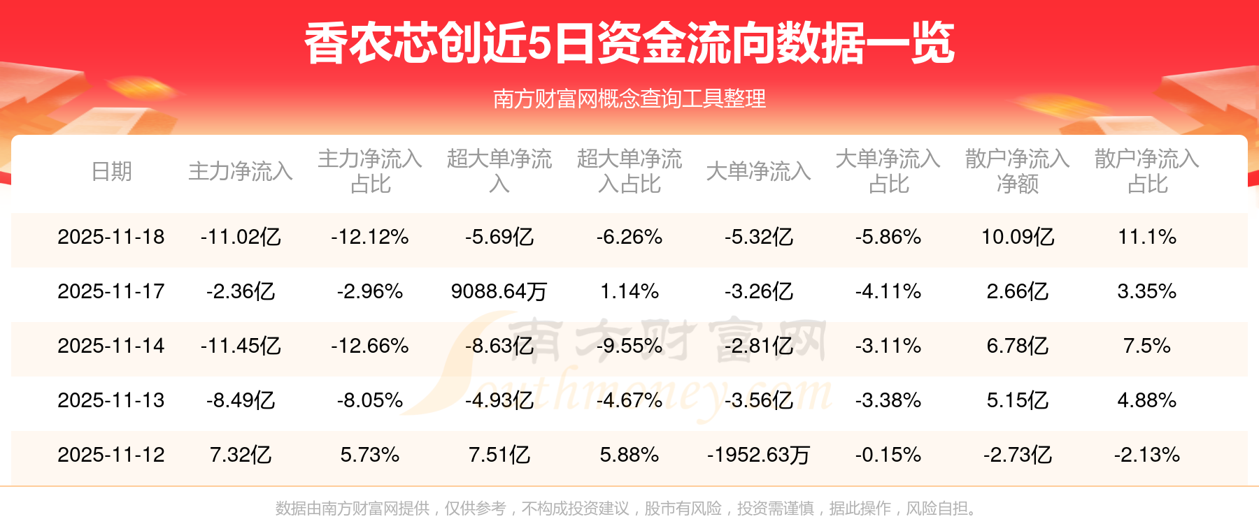 11月18日消息,香农芯创主力资金净流出11.02亿元,超大单资金净流出5.69亿元,散户资金净流入10.09亿元。