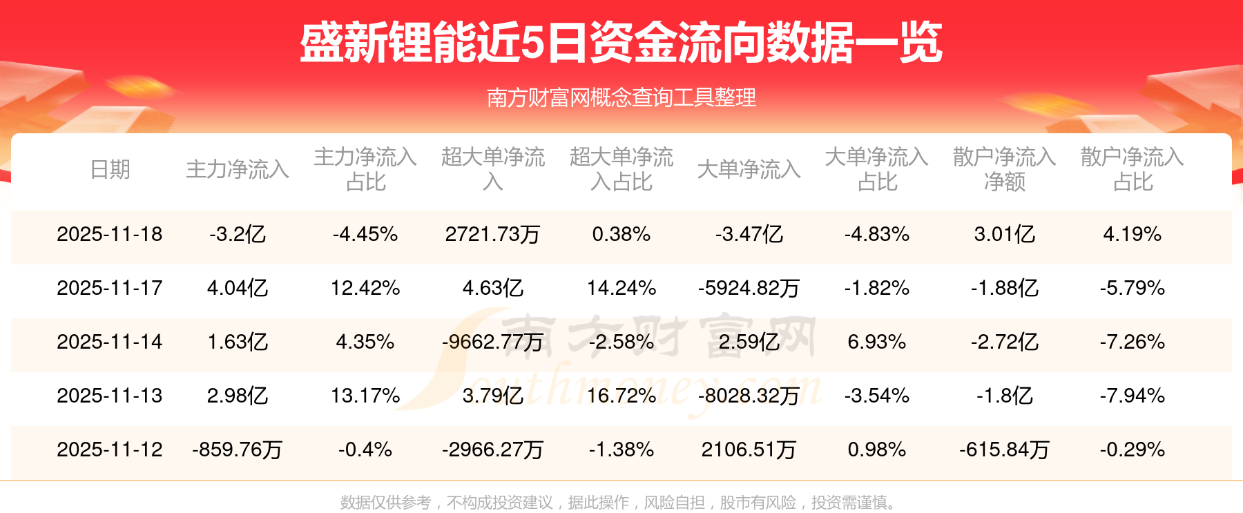 11月18日消息,盛新锂能主力净流出3.2亿元,超大单净流入2721.73万元,散户净流入3.01亿元。