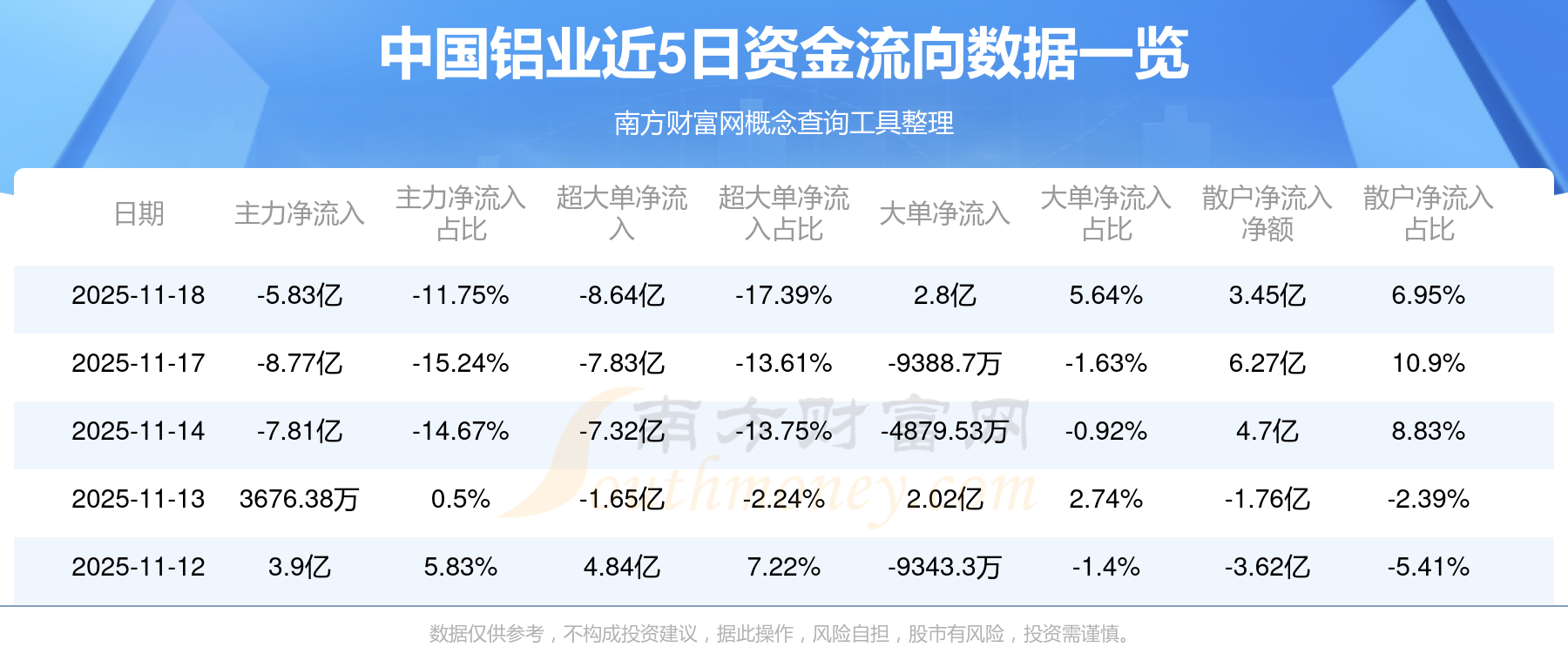 11月18日消息,中国铝业11月18日主力净流出5.83亿元,超大单净流出8.64亿元,大单净流入2.8亿元,散户净流入3.45亿元。