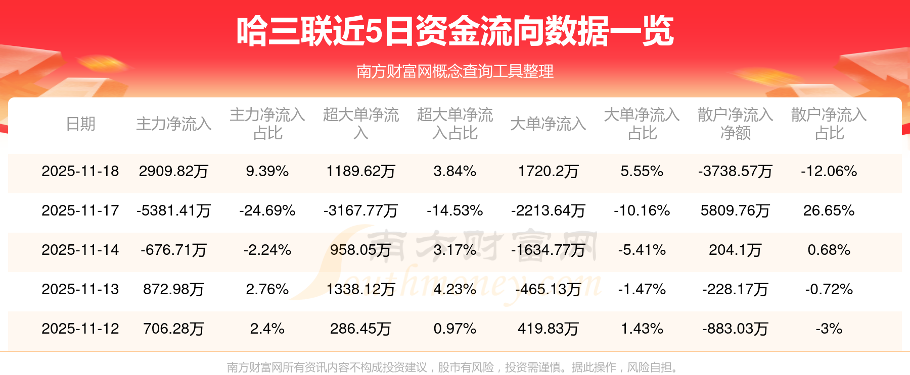 11月18日消息,哈三联11月18日主力资金净流入2909.82万元,超大单资金净流入1189.62万元,大单资金净流入1720.2万元,散户资金净流出3738.57万元。