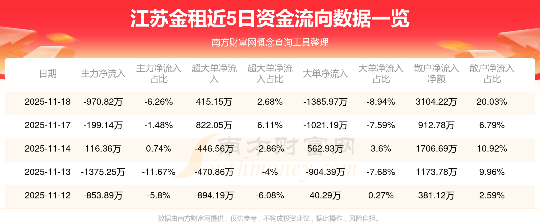 11月18日消息,江苏金租主力资金净流出970.82万元,超大单资金净流入415.15万元,散户资金净流入3104.22万元。