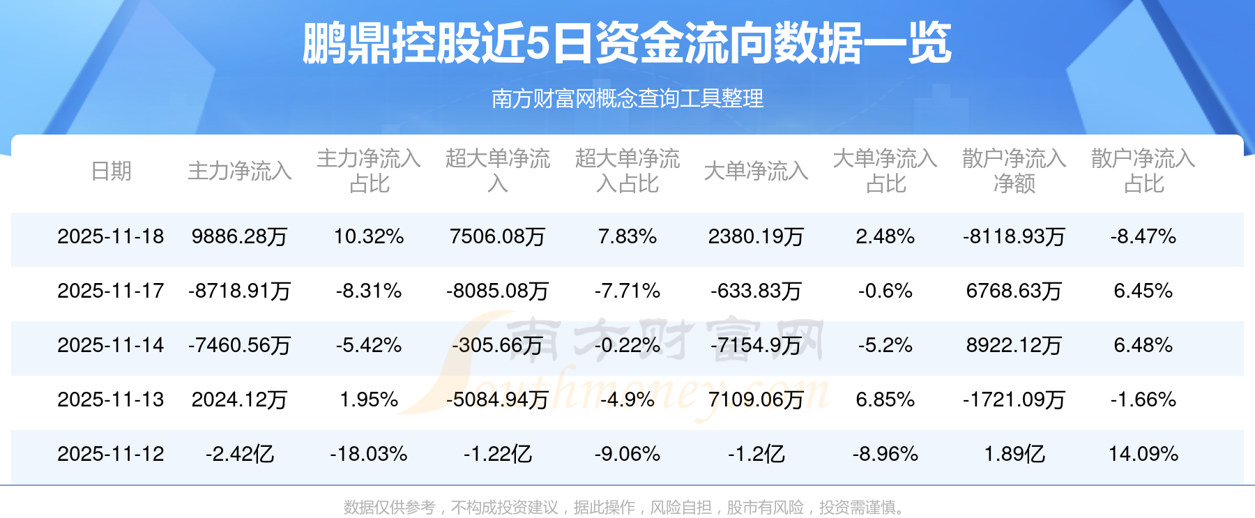 11月18日消息,鹏鼎控股主力净流入9886.28万元,超大单净流入7506.08万元,散户净流出8118.93万元。