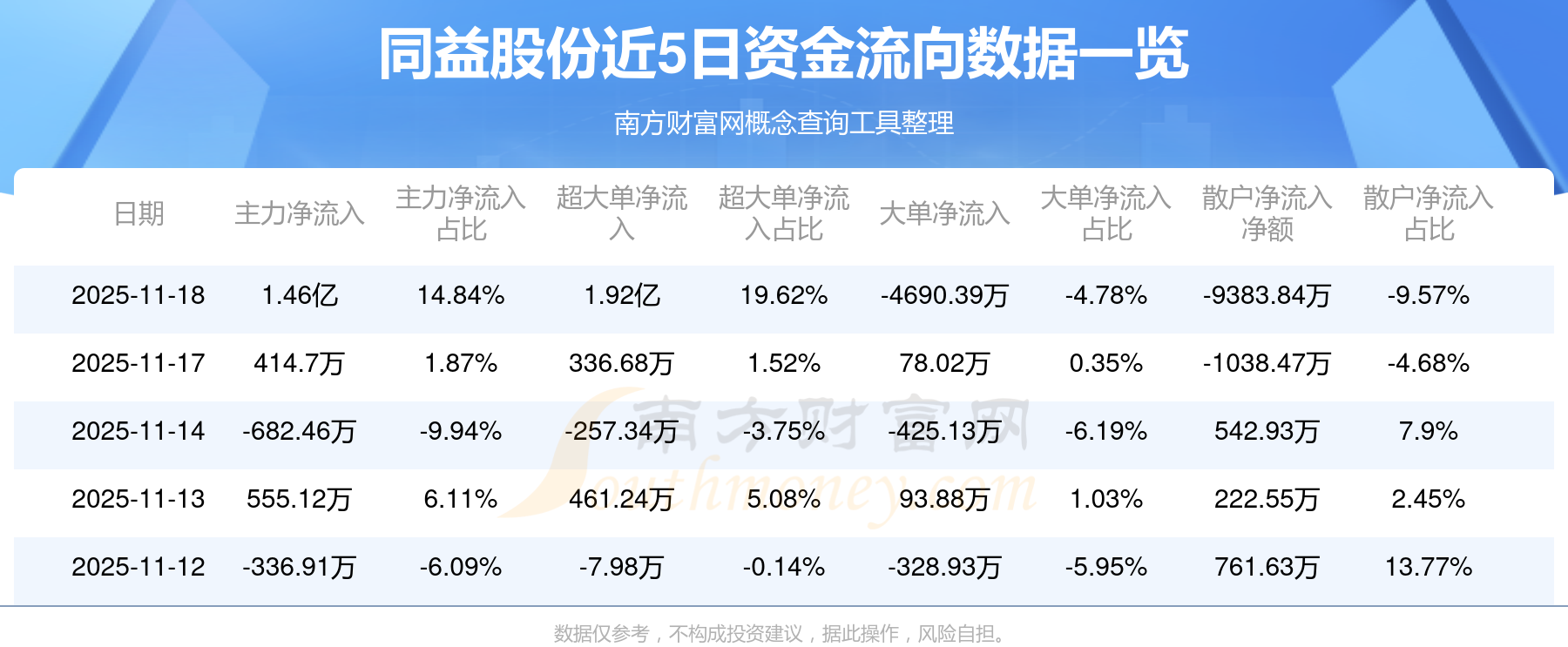 11月18日该股主力资金净流入1.46亿元,超大单资金净流入1.92亿元,大单资金净流出4690.39万元,中单资金净流出5170.96万元,散户资金净流出9383.84万元。