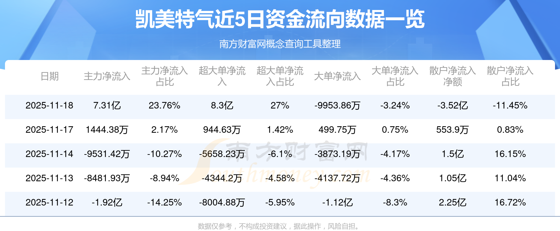11月18日消息,凯美特气11月18日主力资金净流入7.31亿元,超大单资金净流入8.3亿元,大单资金净流出9953.86万元,散户资金净流出3.52亿元。