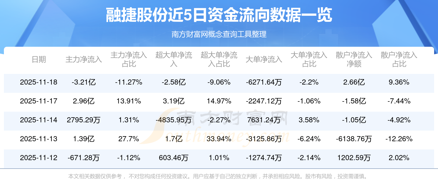 11月18日消息,融捷股份11月18日主力资金净流出3.21亿元,超大单资金净流出2.58亿元,大单资金净流出6271.64万元,散户资金净流入2.66亿元。