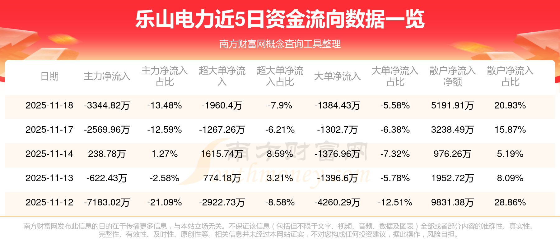 11月18日消息,乐山电力11月18日主力净流出3344.82万元,超大单净流出1960.4万元,大单净流出1384.43万元,散户净流入5191.91万元。
