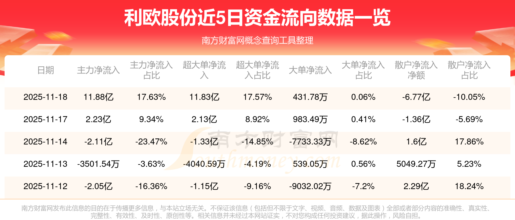 11月18日消息,利欧股份11月18日主力资金净流入11.88亿元,超大单资金净流入11.83亿元,大单资金净流入431.78万元,散户资金净流出6.77亿元。
