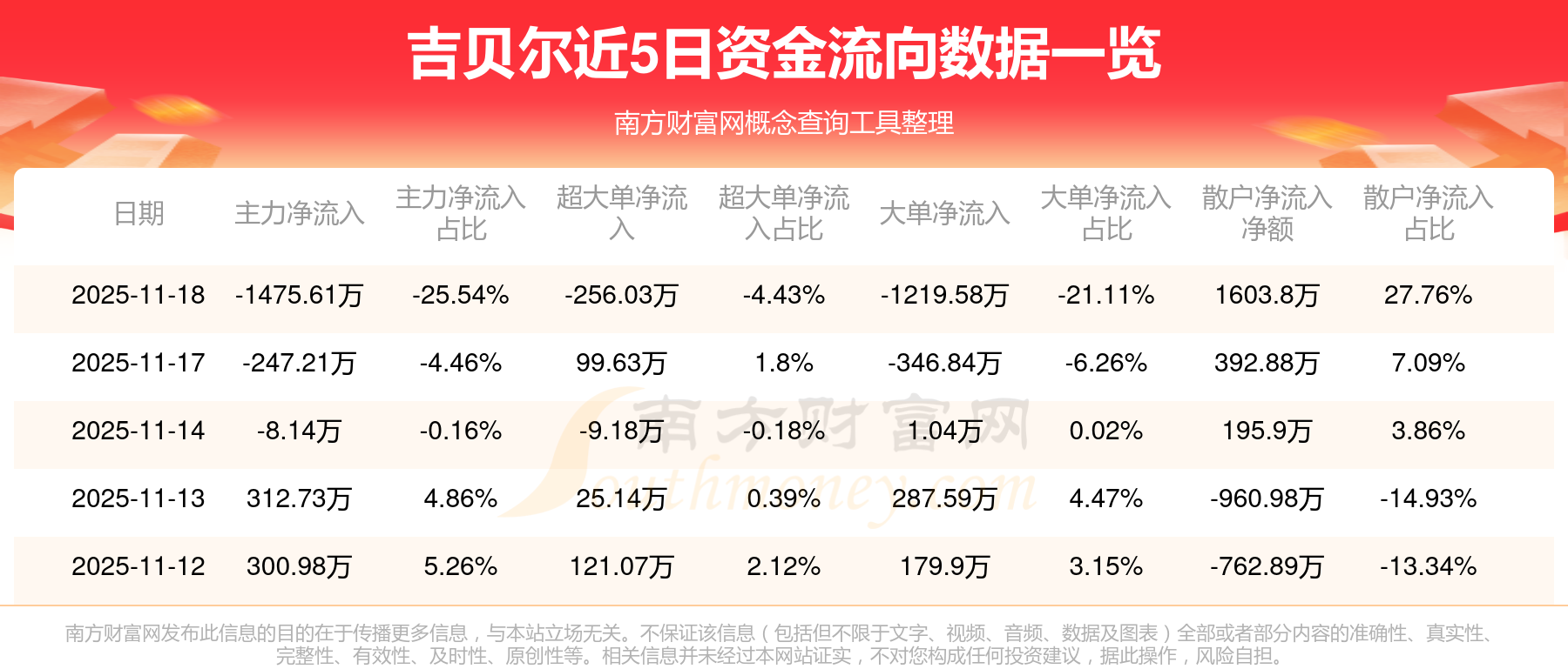 11月18日该股主力资金净流出1475.61万元,超大单资金净流出256.03万元,大单资金净流出1219.58万元,中单资金净流出128.19万元,散户资金净流入1603.8万元。