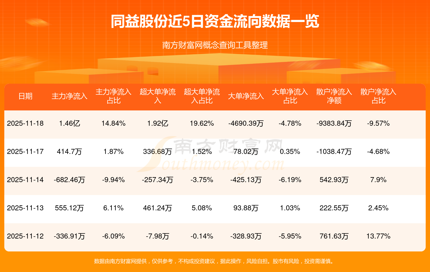 11月18日消息,同益股份11月18日主力净流入1.46亿元,超大单净流入1.92亿元,大单净流出4690.39万元,散户净流出9383.84万元。