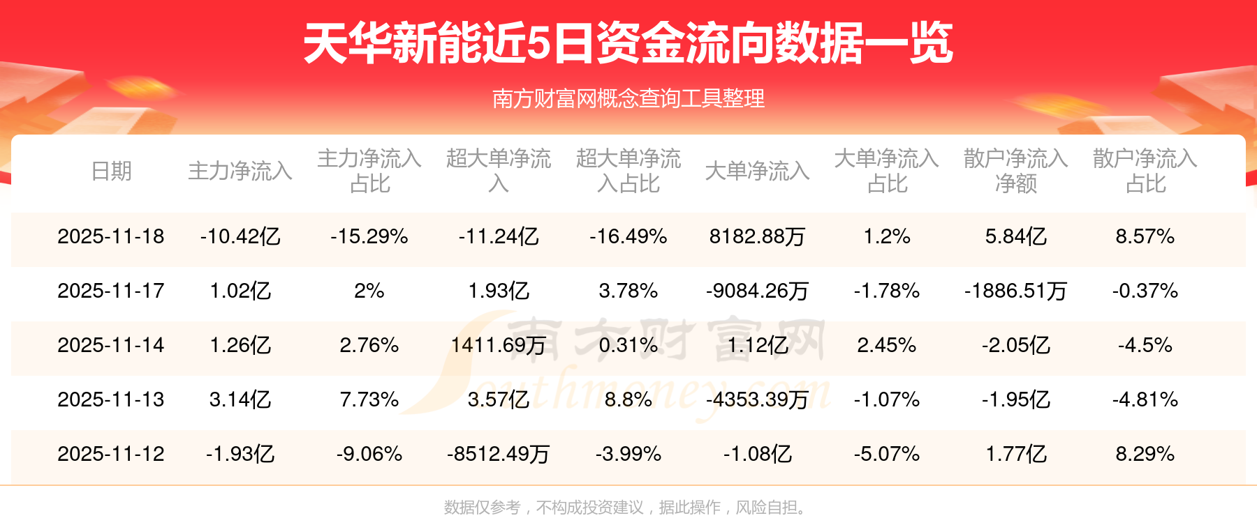11月18日消息,天华新能主力资金净流出10.42亿元,超大单资金净流出11.24亿元,散户资金净流入5.84亿元。