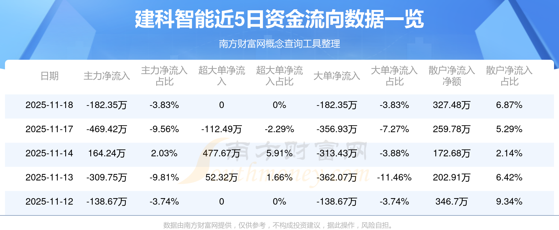 11月18日消息,建科智能主力净流出182.35万元,散户净流入327.48万元。