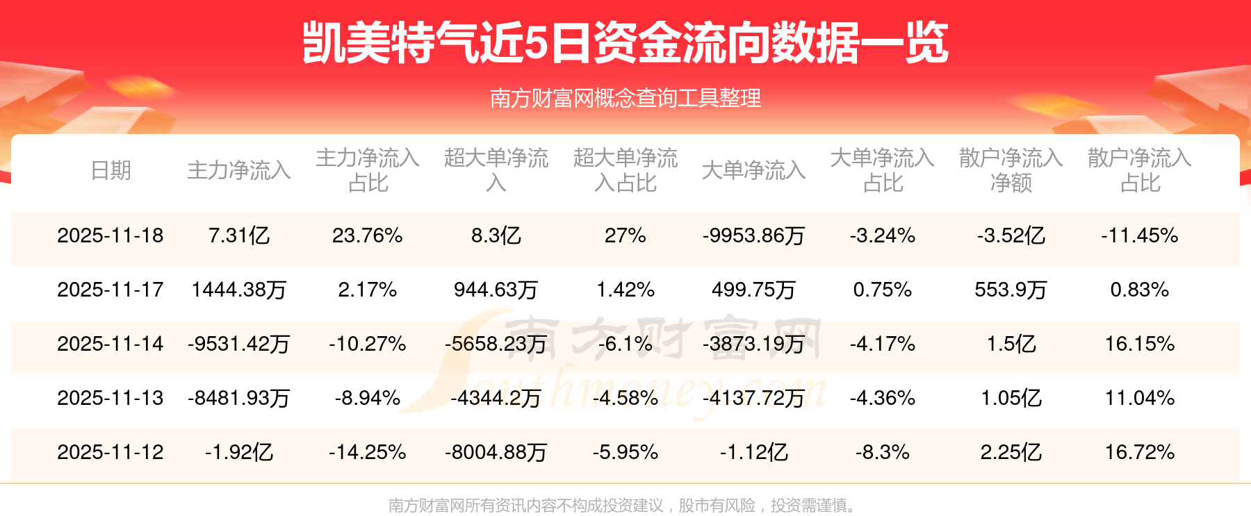 11月18日该股主力资金净流入7.31亿元,超大单资金净流入8.3亿元,大单资金净流出9953.86万元,中单资金净流出3.78亿元,散户资金净流出3.52亿元。