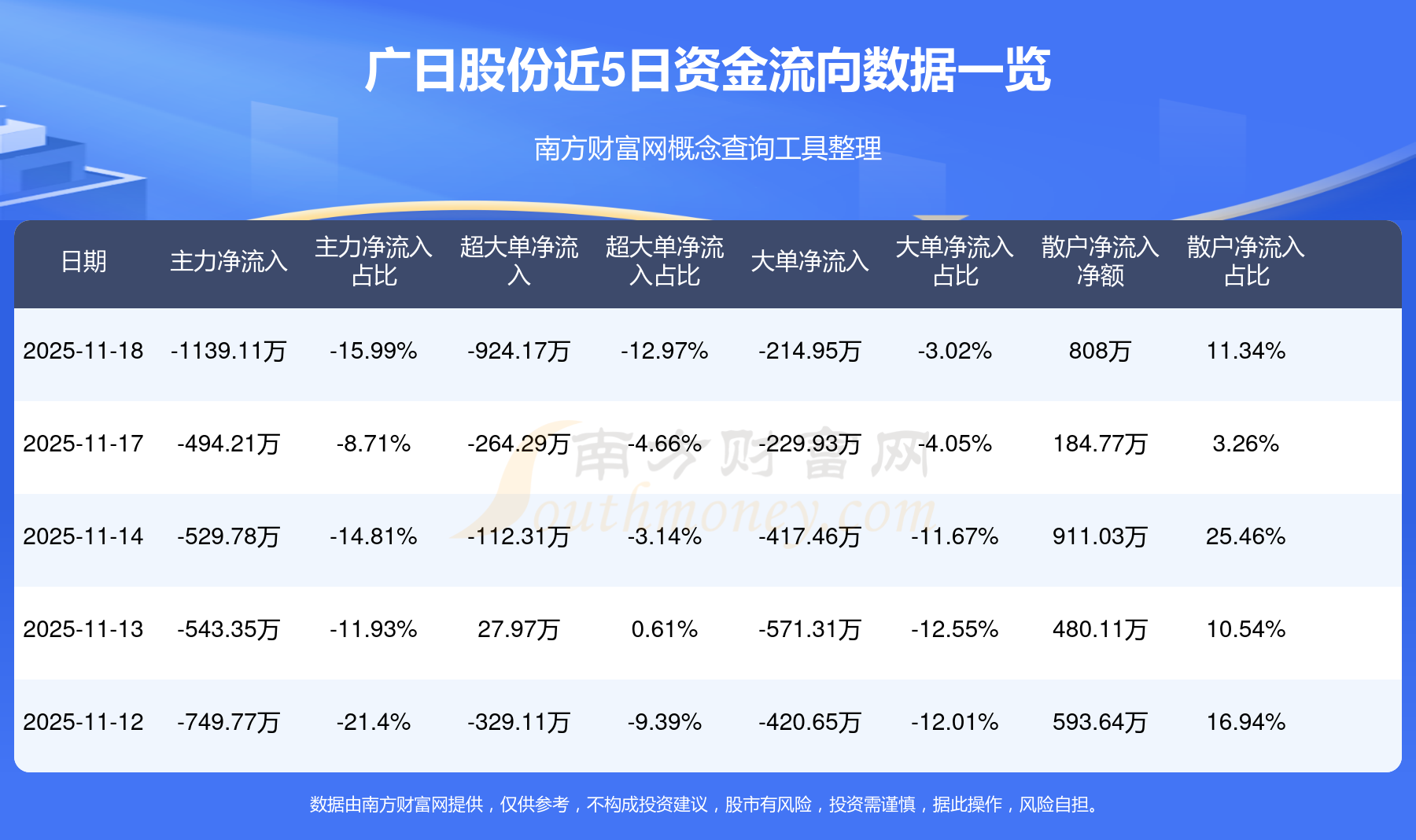 11月18日消息,广日股份资金净流出1139.11万元,超大单净流出924.17万元,换手率0.42%,成交金额3295.72万元。