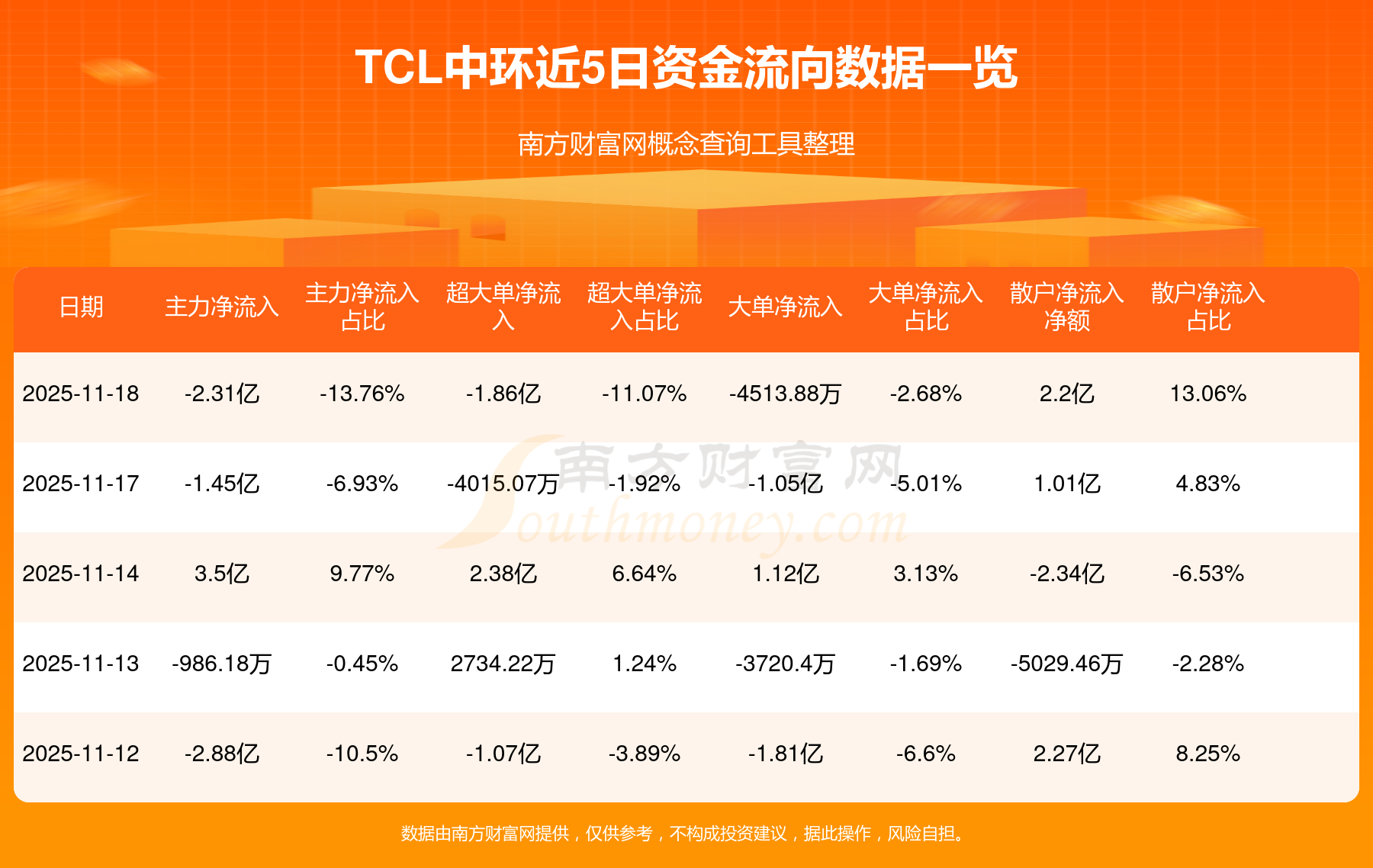 11月18日消息,TCL中环资金净流出2.31亿元,超大单资金净流出1.86亿元,换手率4.01%,成交金额16.68亿元。