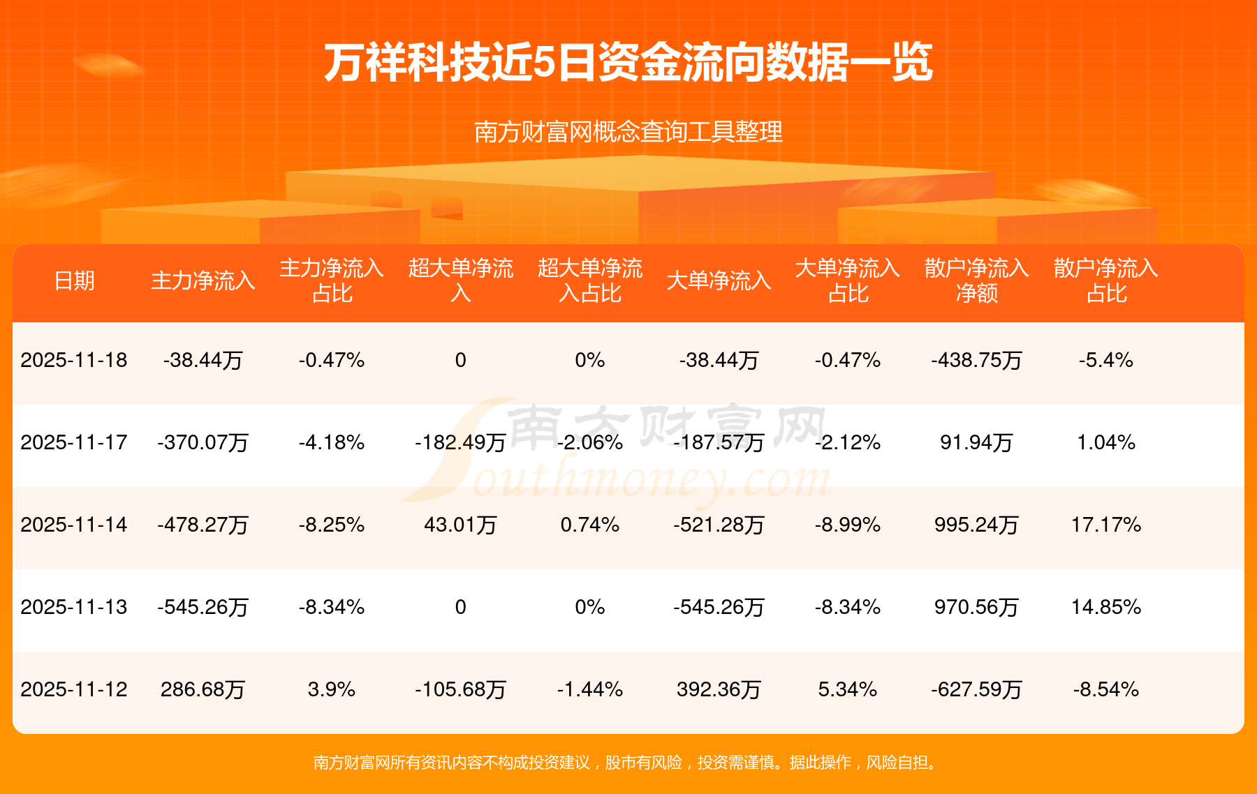 11月18日消息,万祥科技主力净流出38.44万元,散户净流出438.75万元。