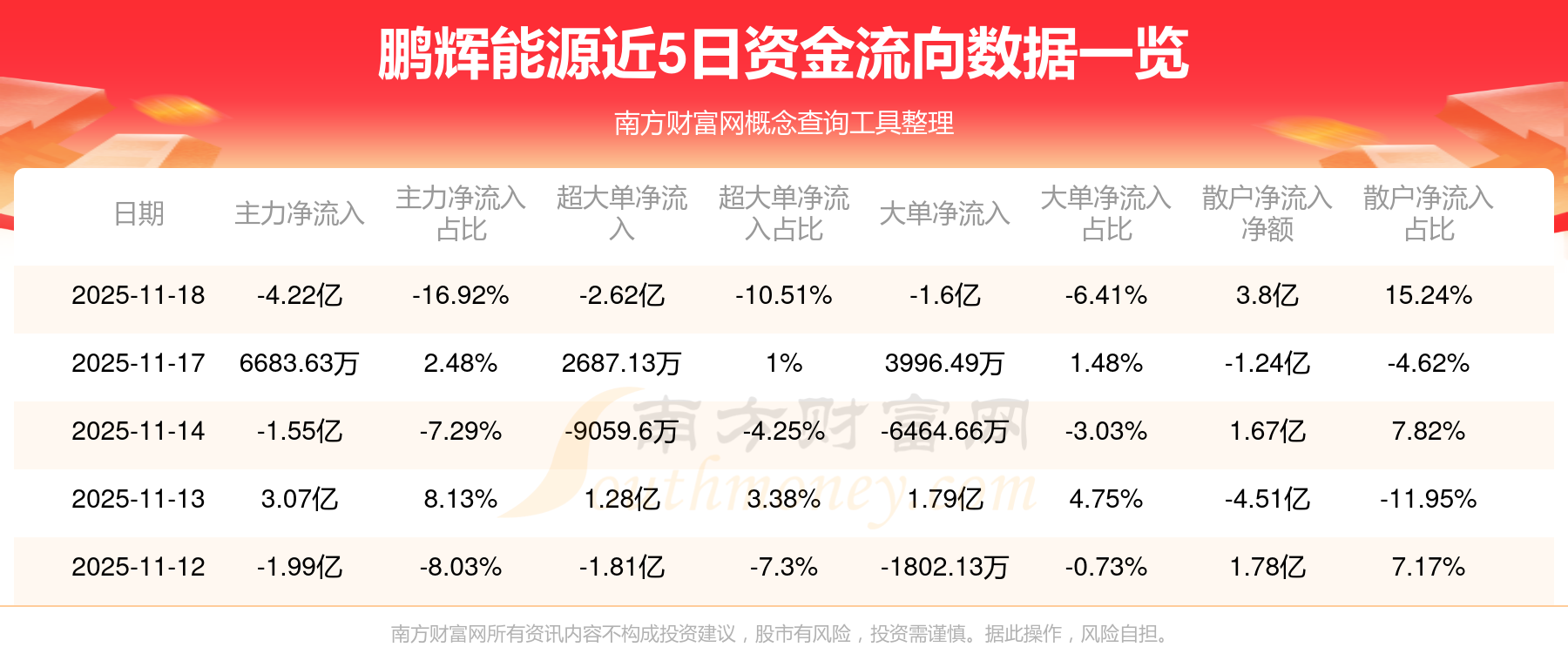 11月18日消息,鹏辉能源11月18日主力净流出4.22亿元,超大单净流出2.62亿元,大单净流出1.6亿元,散户净流入3.8亿元。