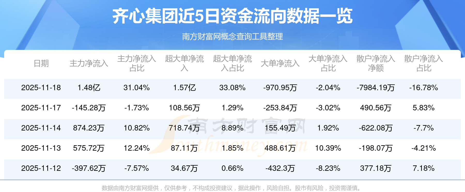 11月18日消息,齐心集团主力净流入1.48亿元,超大单净流入1.57亿元,散户净流出7984.19万元。