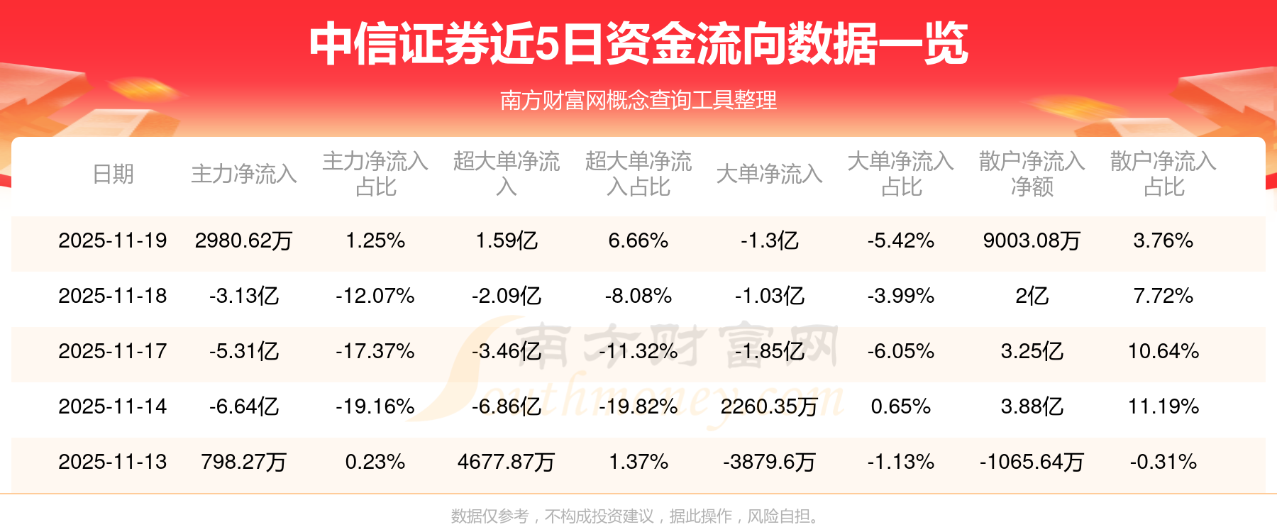 11月19日消息,中信证券资金净流入2980.62万元,超大单资金净流入1.59亿元,换手率0.69%,成交金额23.93亿元。