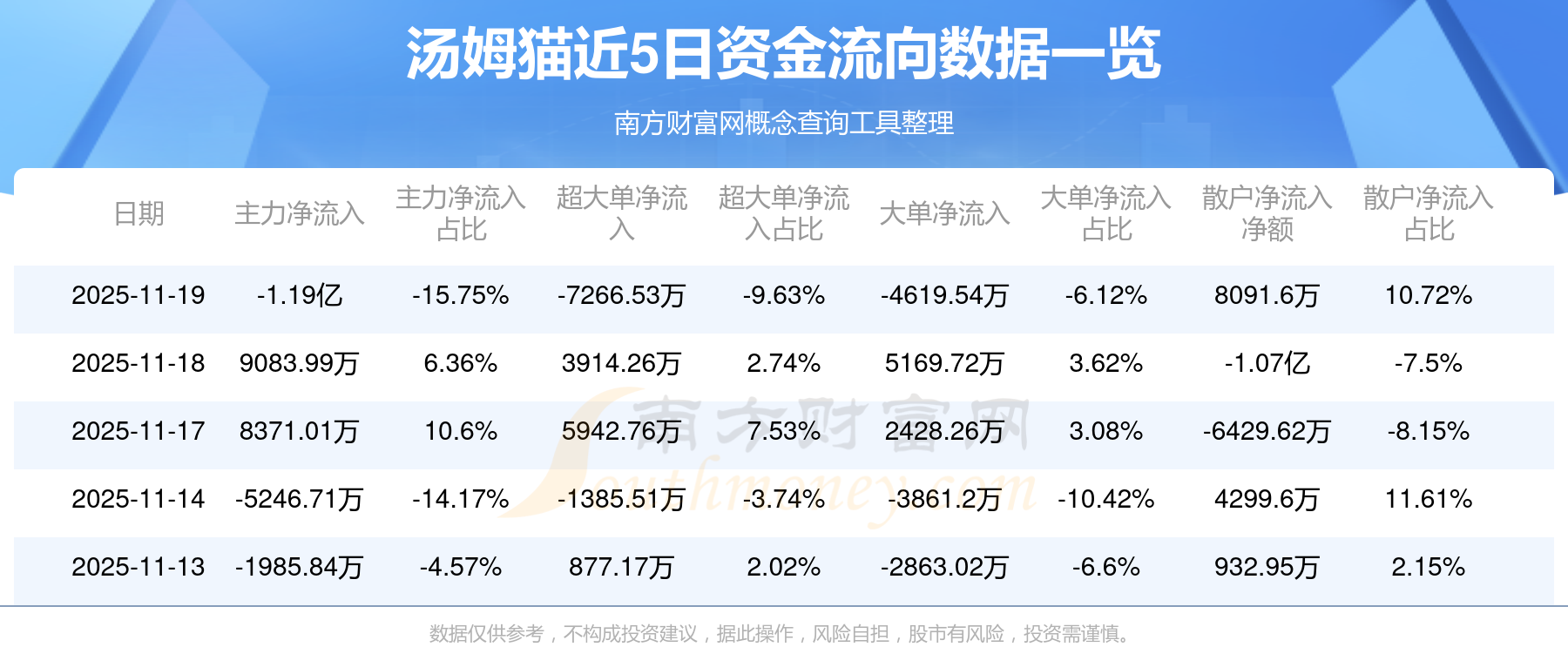 11月19日消息,汤姆猫主力资金净流出1.19亿元,超大单资金净流出7266.53万元,散户资金净流入8091.6万元。