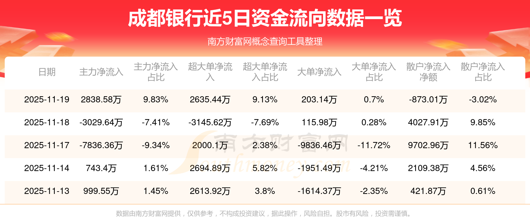 11月19日消息,成都银行11月19日主力净流入2838.58万元,超大单净流入2635.44万元,大单净流入203.14万元,散户净流出873.01万元。