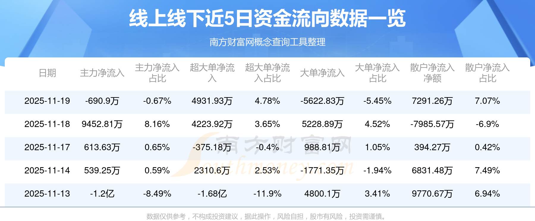 11月19日消息,线上线下11月19日主力净流出690.9万元,超大单净流入4931.93万元,大单净流出5622.83万元,散户净流入7291.26万元。