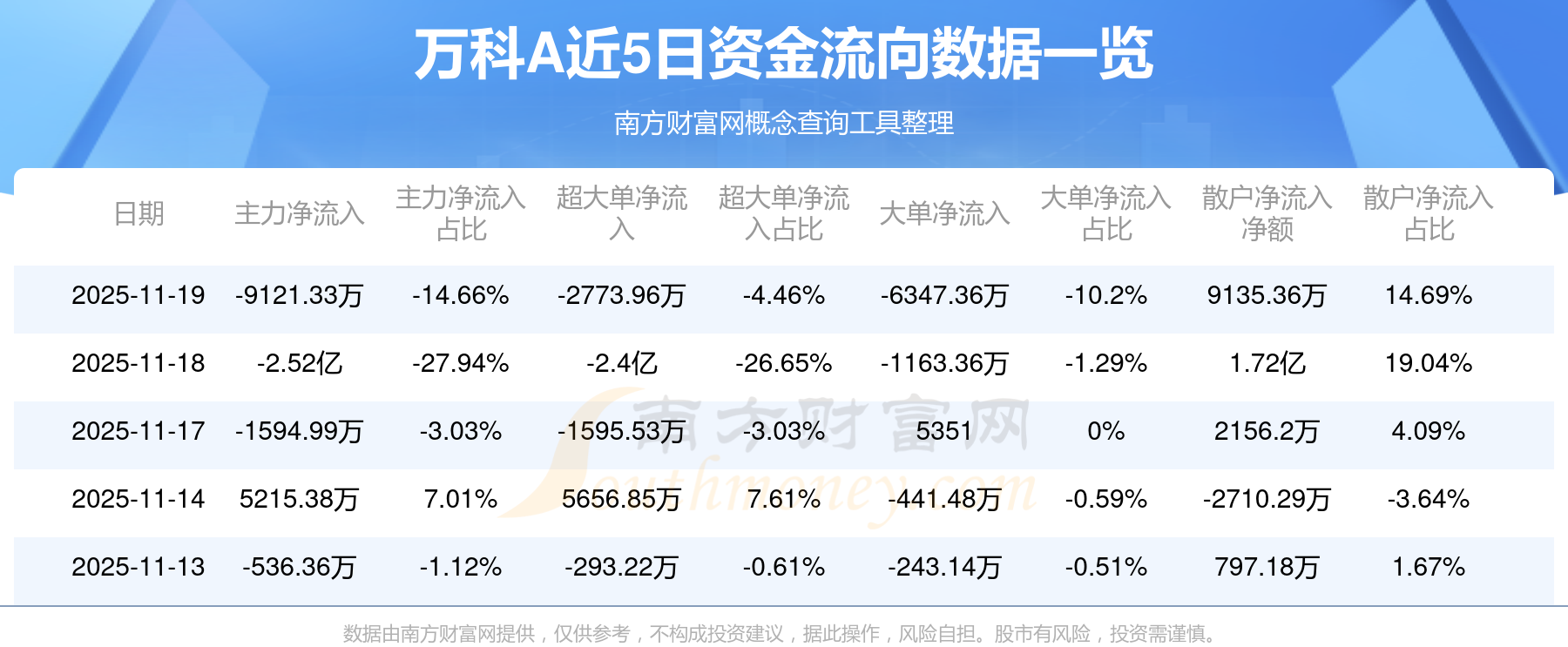11月19日消息,万科A资金净流出9121.33万元,超大单净流出2773.96万元,换手率1.05%,成交金额6.22亿元。
