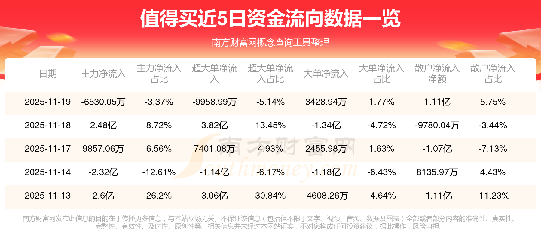 11月19日消息,值得买资金净流出6530.05万元,超大单净流出9958.99万元,换手率35.58%,成交金额19.38亿元。