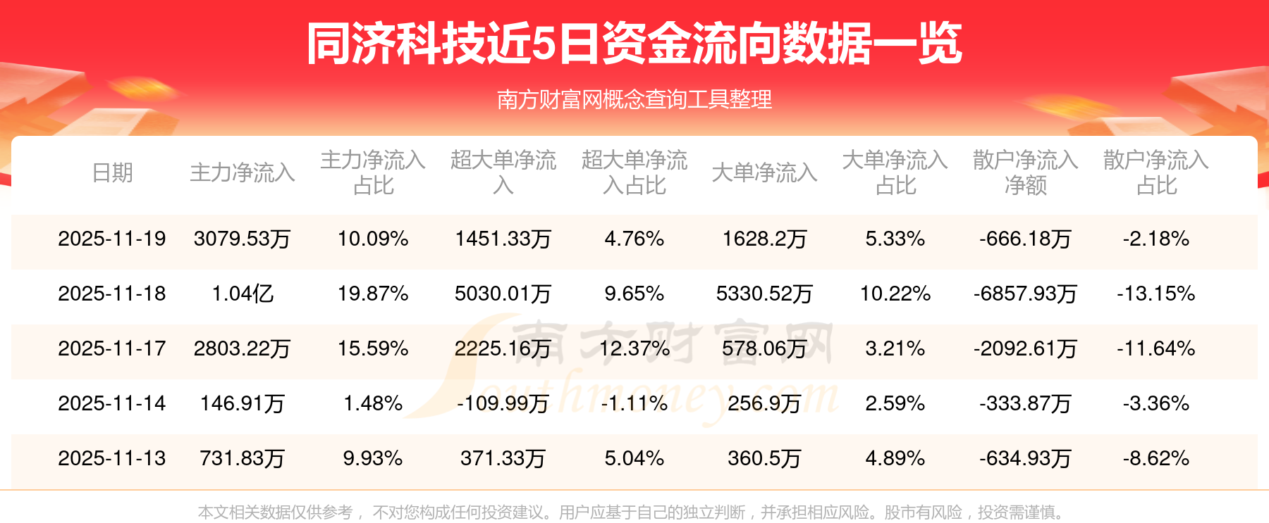 11月19日消息,同济科技11月19日主力资金净流入3079.53万元,超大单资金净流入1451.33万元,大单资金净流入1628.2万元,散户资金净流出666.18万元。
