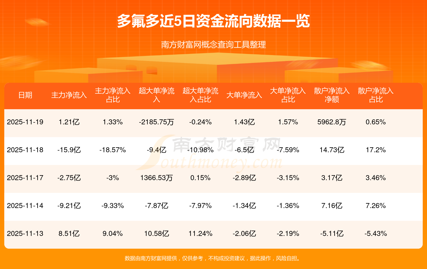 11月19日消息,多氟多11月19日主力净流入1.21亿元,超大单净流出2185.75万元,大单净流入1.43亿元,散户净流入5962.8万元。
