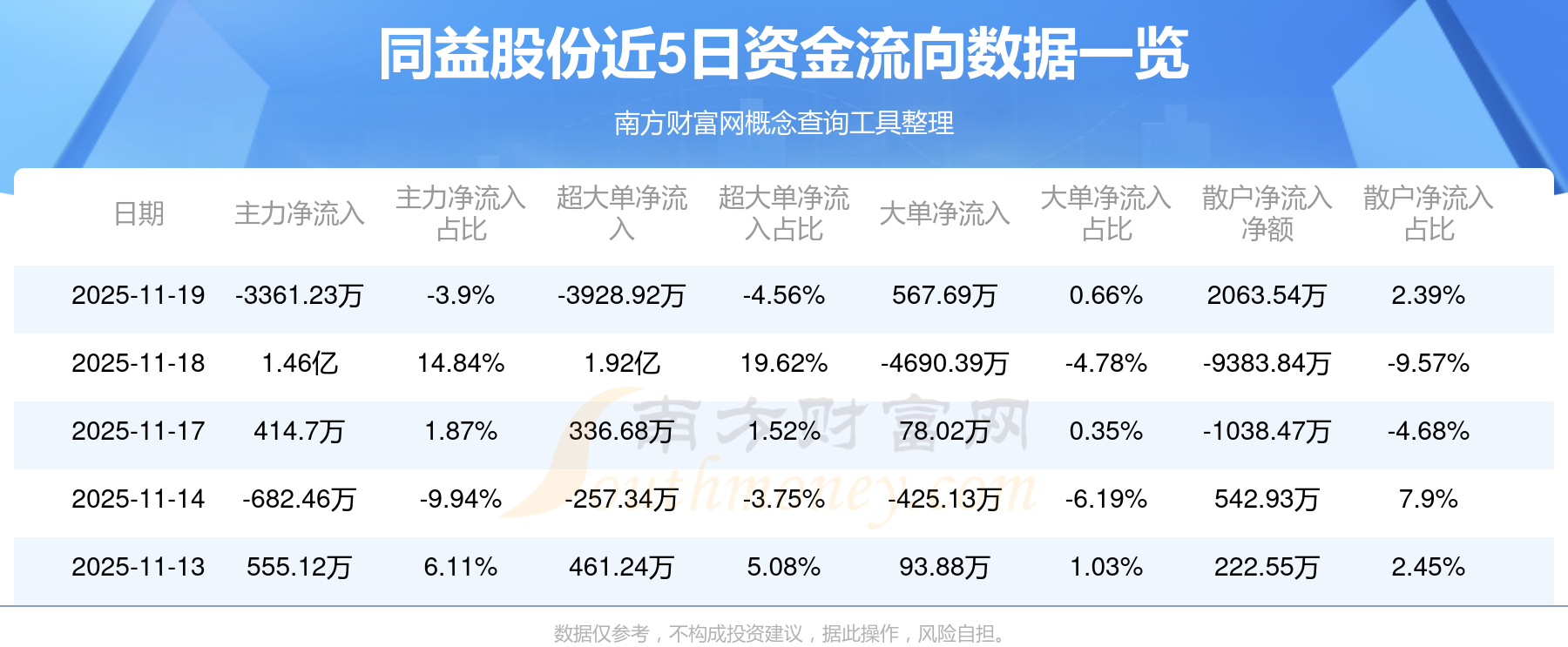 11月19日消息,同益股份资金净流出3361.23万元,超大单净流出3928.92万元,换手率37.2%,成交金额8.62亿元。