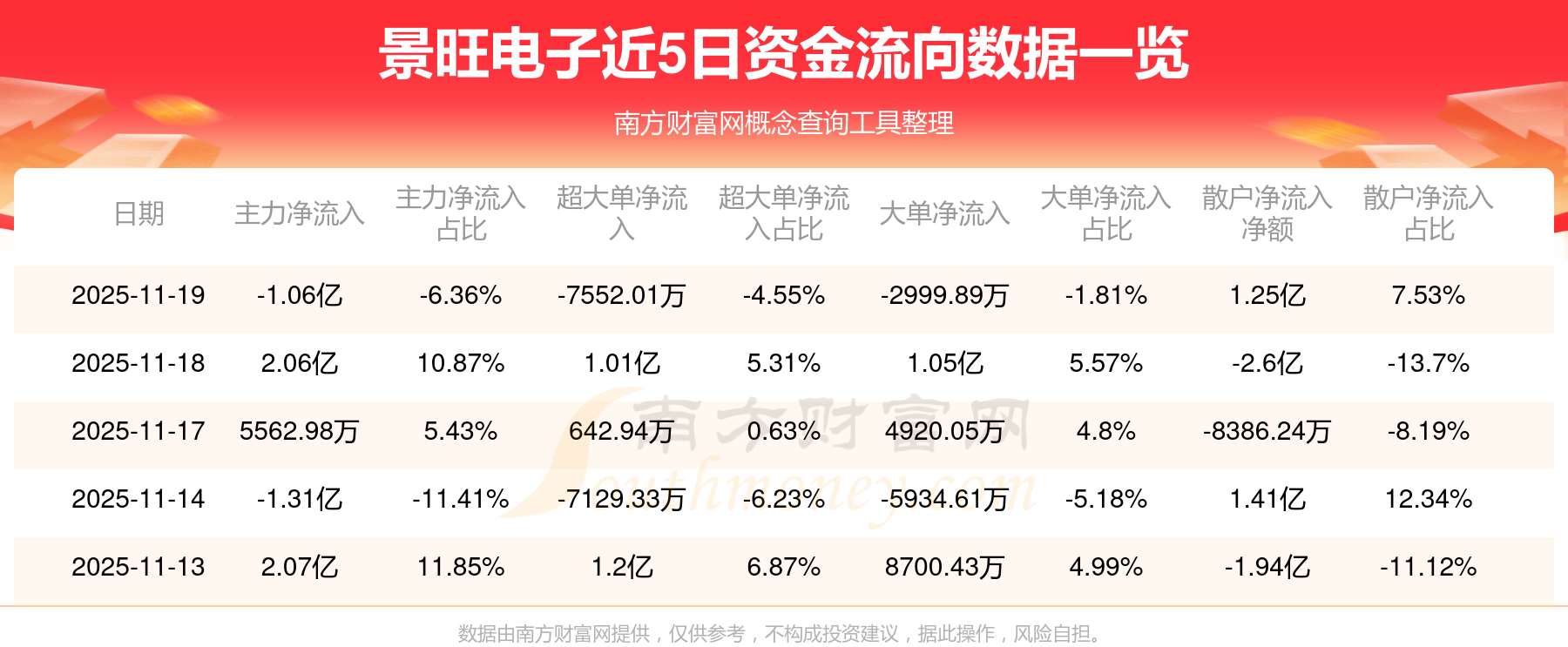 11月19日消息,景旺电子11月19日主力净流出1.06亿元,超大单净流出7552.01万元,大单净流出2999.89万元,散户净流入1.25亿元。