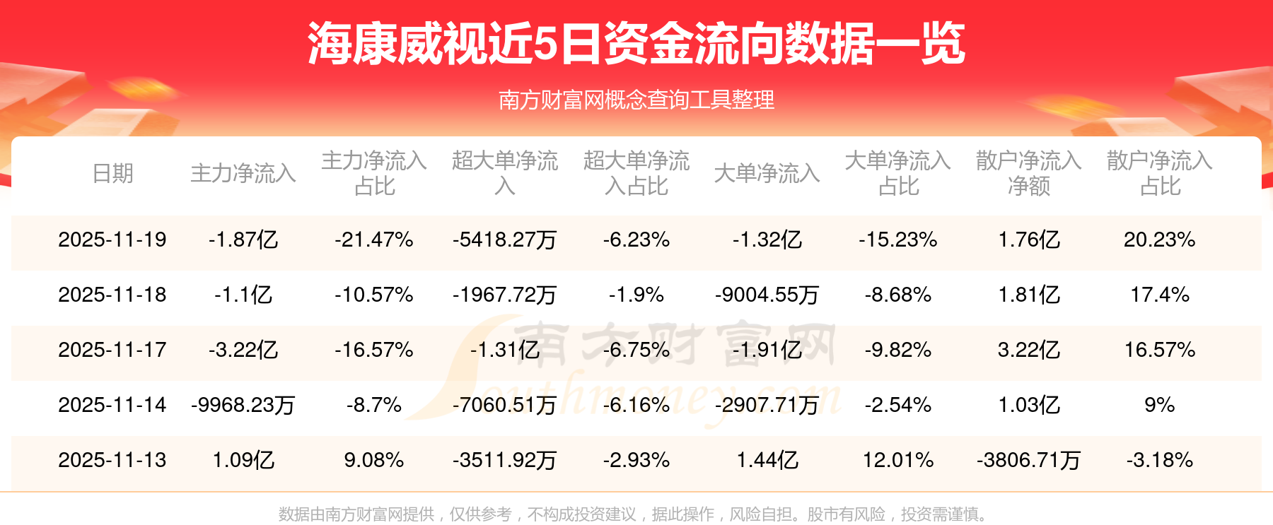 11月19日消息,海康威视资金净流出1.87亿元,超大单资金净流出5418.27万元,换手率0.31%,成交金额8.69亿元。
