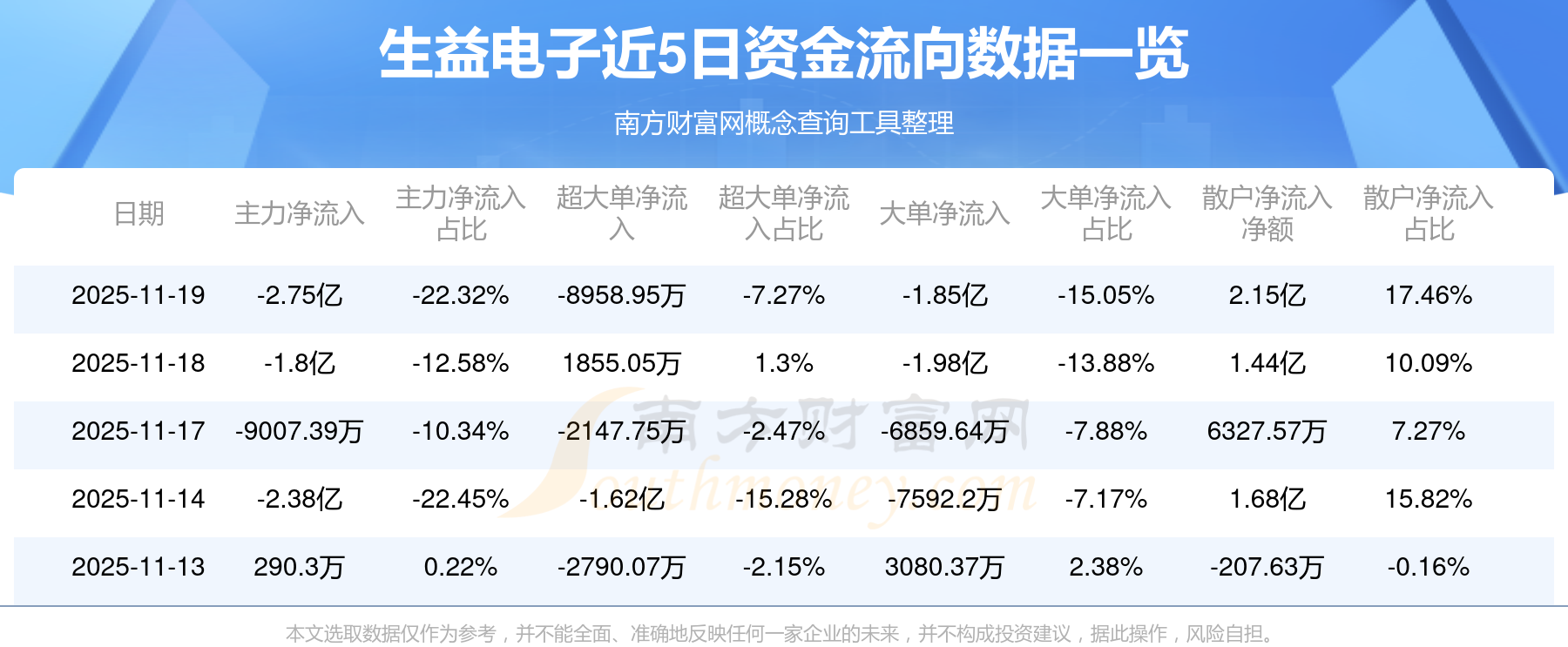 11月19日消息,生益电子11月19日主力资金净流出2.75亿元,超大单资金净流出8958.95万元,大单资金净流出1.85亿元,散户资金净流入2.15亿元。