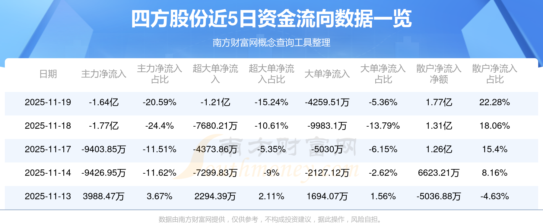 11月19日该股主力资金净流出1.64亿元,超大单资金净流出1.21亿元,大单资金净流出4259.51万元,中单资金净流出1341.78万元,散户资金净流入1.77亿元。