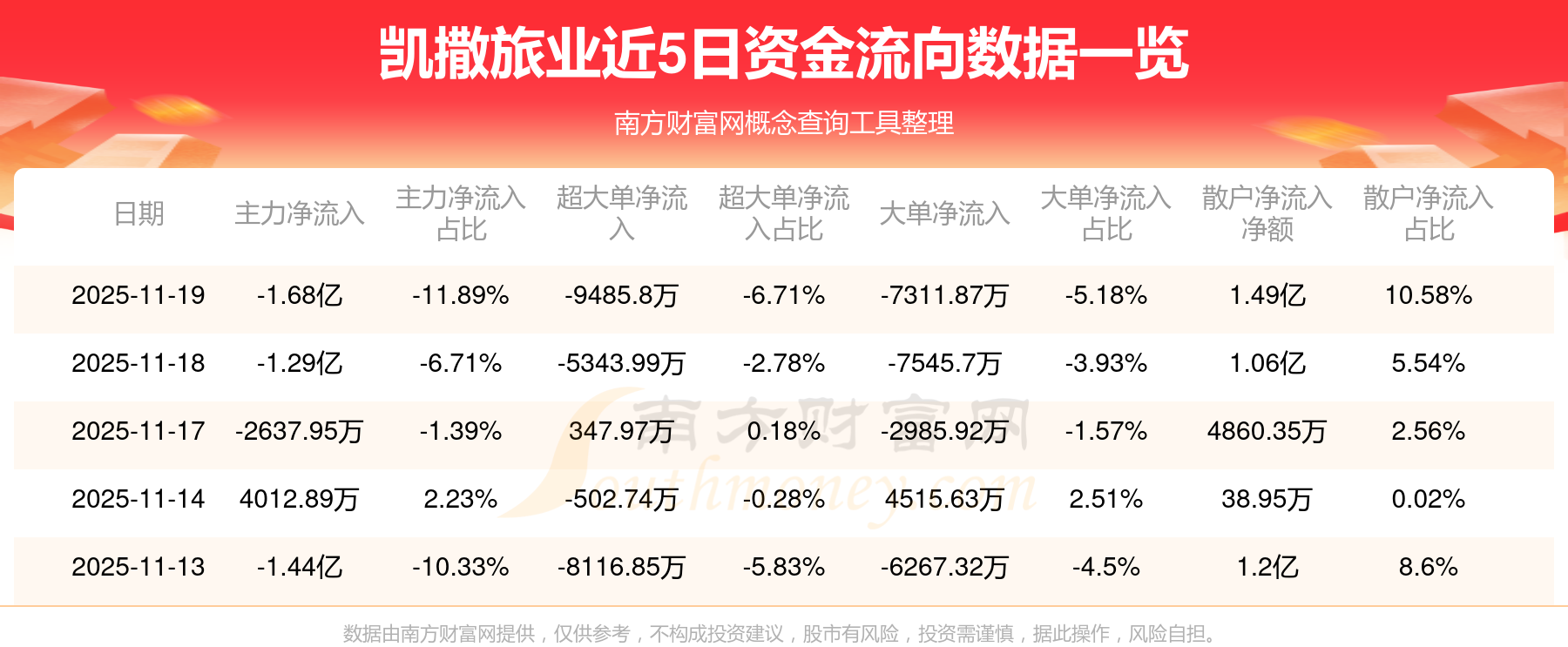 11月19日消息,凯撒旅业11月19日主力资金净流出1.68亿元,超大单资金净流出9485.8万元,大单资金净流出7311.87万元,散户资金净流入1.49亿元。