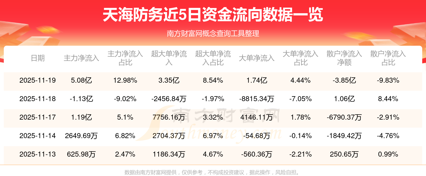 11月13日收盘消息,天海防务5日内股价上涨15.73%,今年来涨幅上涨40.15%,最新报7.820元,涨1.07%,市盈率为97.51。